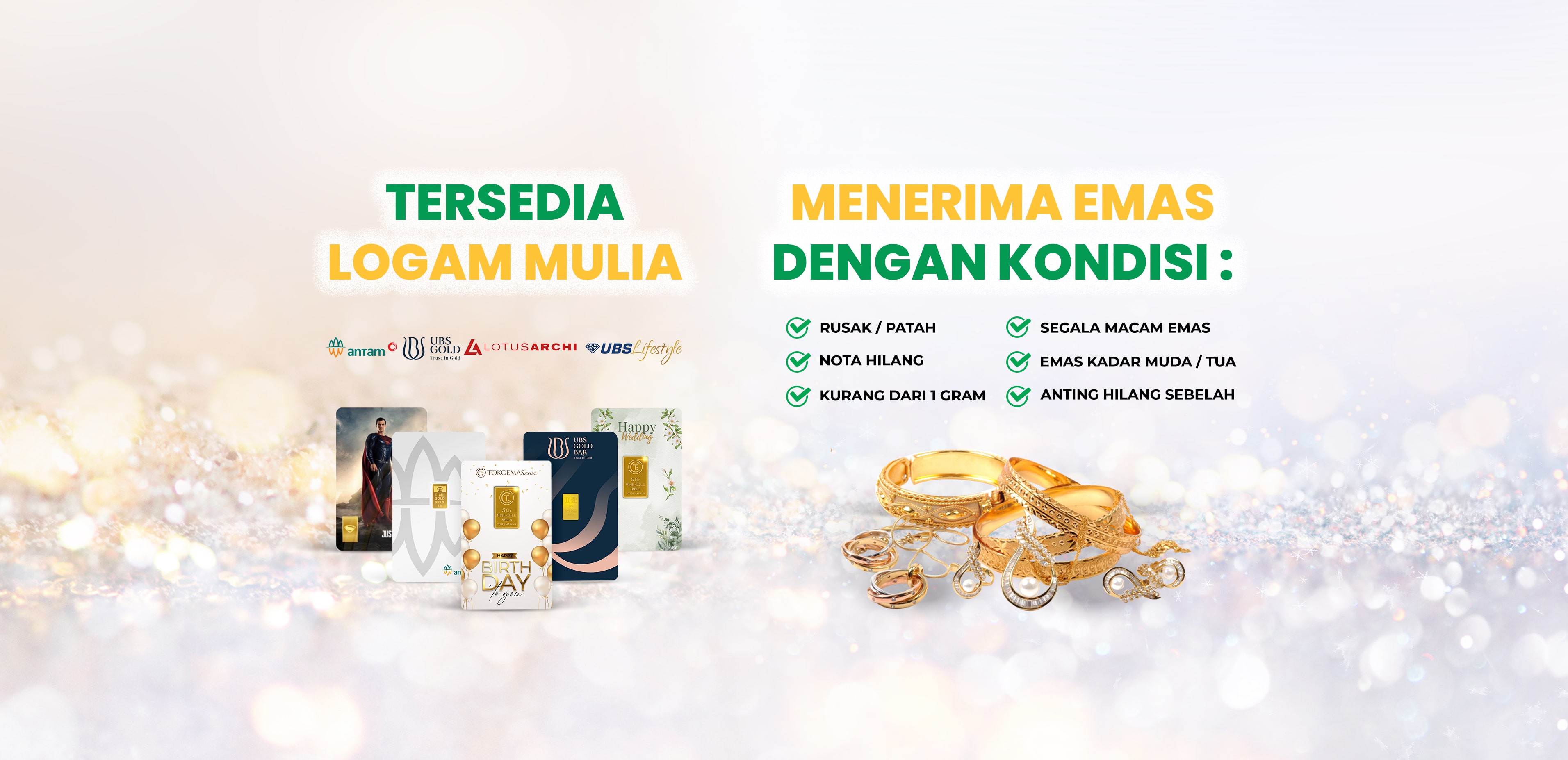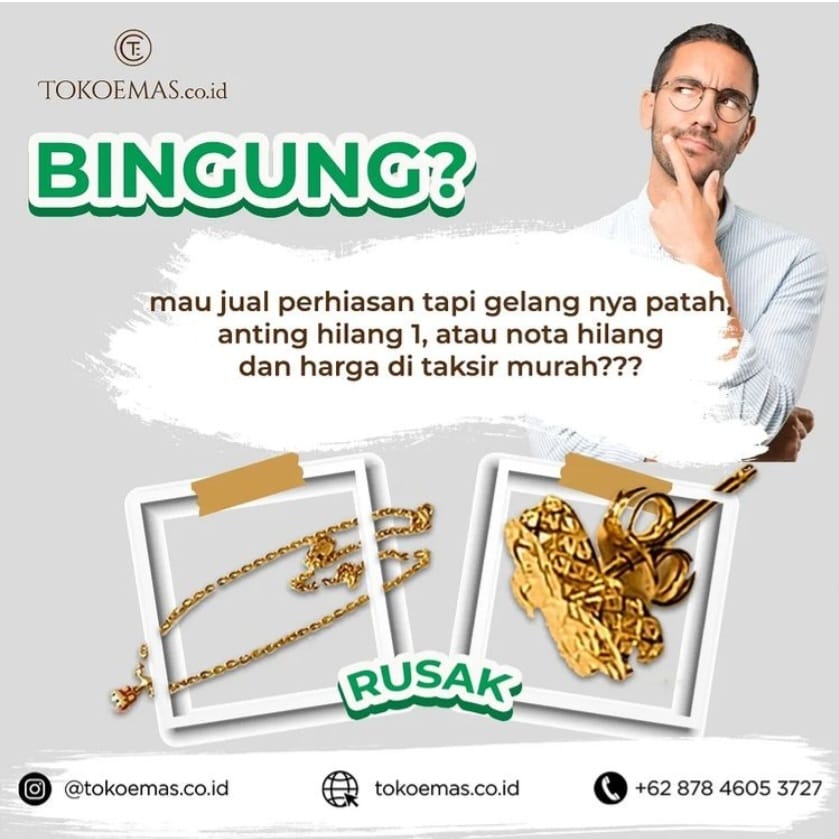 Tokoemas.co.id Menerima emas dengan segala kondisi, baik mulai dari logam mulia, emas batangan, perhiasan rusak, perhiasan patah, emas nota hilang, anting hilang sebelah, emas dengan berat 0,1 gram maupun emas kadar tua atau kadar muda dengan tetap mengikuti Harga jual-beli emas terupdate hari ini. Segera Cek harga emasmu terkini di : www.tokoemas.co.id/harga-emas
